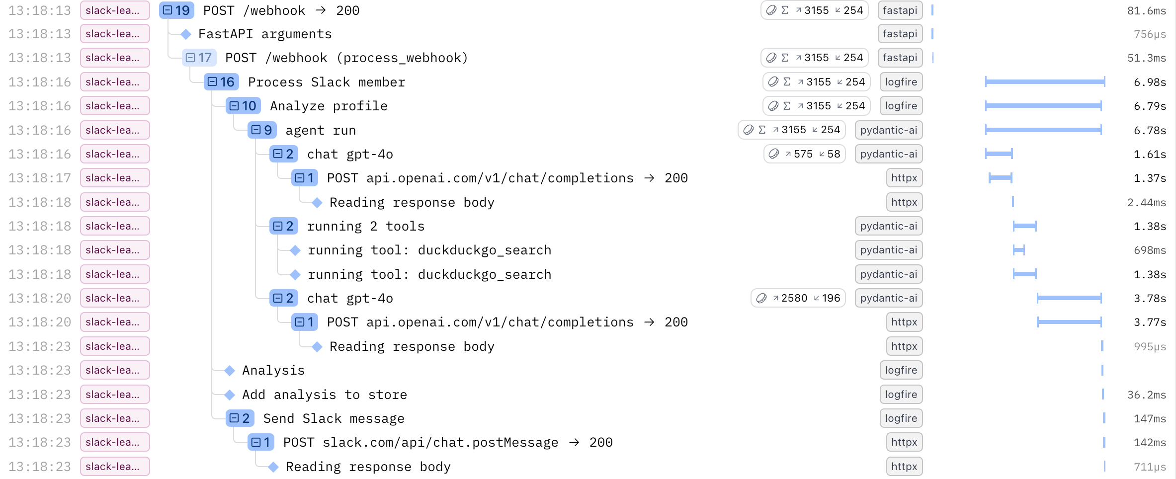 We also pass along the current Logfire context to get Distributed Tracing, meaning that the background function execution will show up nested under the webhook request trace, so that we have everything related to that request in one place.